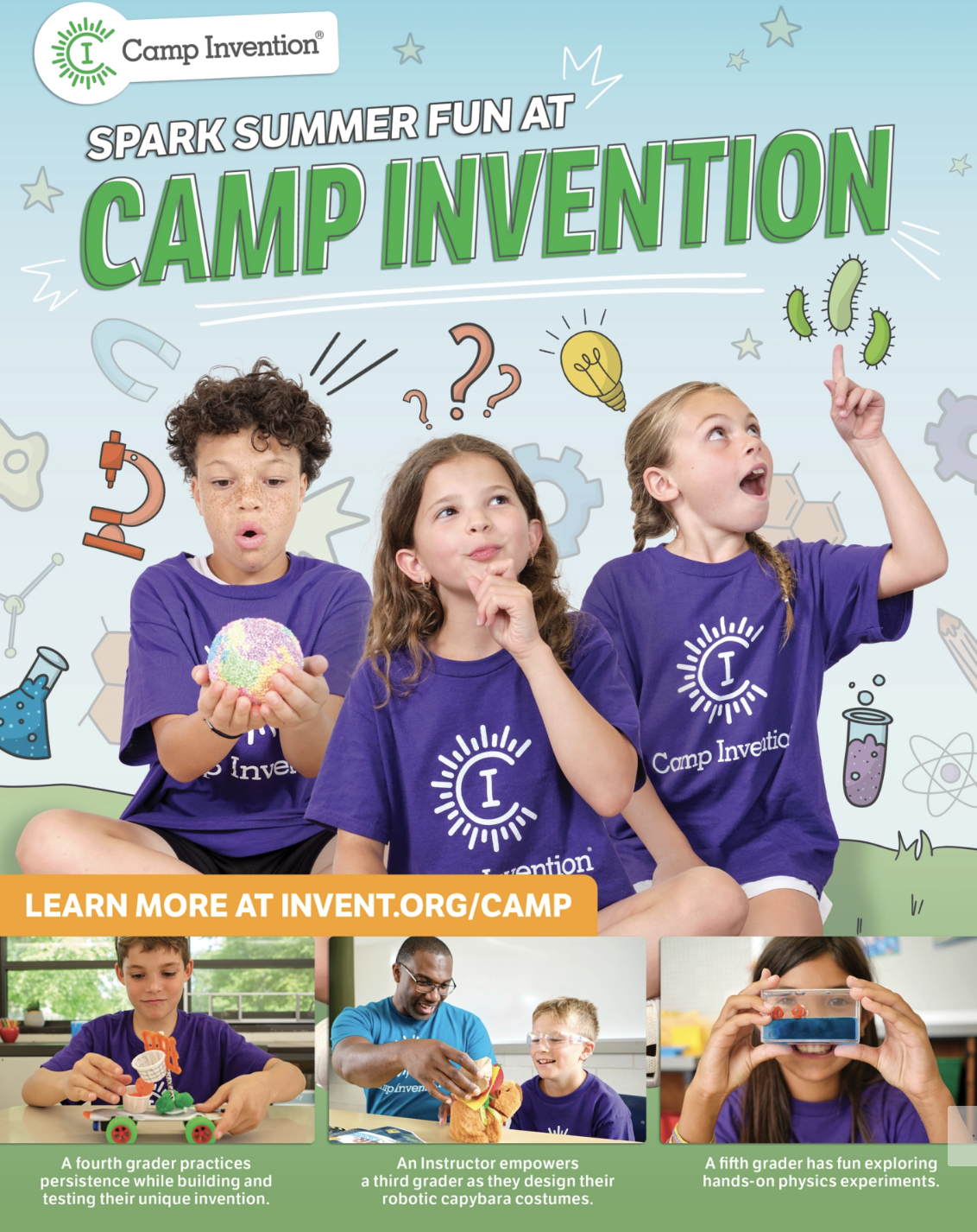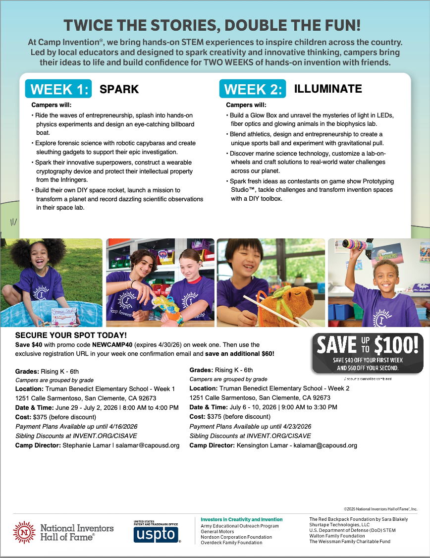 Finally, parents who would like to register for both weeks of Camp Invention can save $60 off their second week registration. Once they complete their first registration, a confirmation email will be sent including a unique URL. They will need to register for the second week using the unique URL, and a promo code for $60 off will automatically be applied to their next registration.